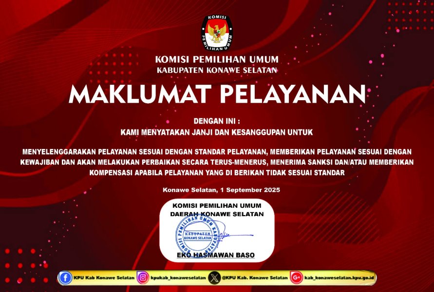 maklumat pelayanan KPU Kabupaten Konawe Selatan bertujuan untuk memberikan pelayanan sesuai dengan kewajiban dan akan melakukan perbaikan secara terus-menerus, menerima sangksi dan/atau memberikan kompensasi apabila pelayanan yang di berikan tidak sesuai standar.
