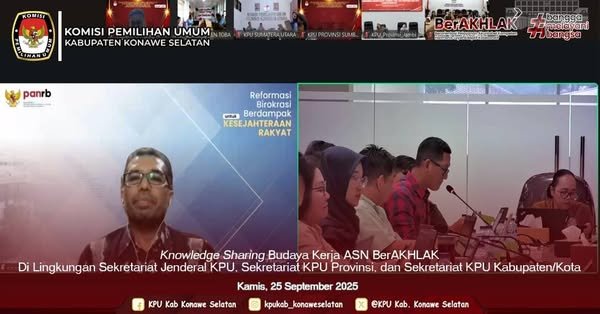 #TemanPemilih, KPU Kab. Konawe Selatan Mengikuti Kegiatan Knowledge Sharing Budaya Kerja ASN BerAKHLAK Di Lingkungan Sekretariat Jenderal KPU, Sekretariat KPU Provinsi, dan Sekretariat KPU Kabupaten/Kota bersama KemenPAN-RB selaku Narasumber yang dilaksanakan secara Daring (Zoom Meeting). Kamis, 25 September 2025