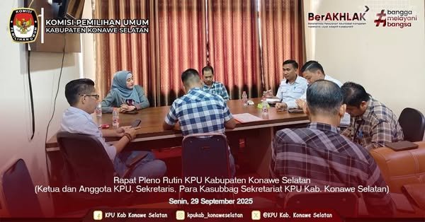 #TemanPemilih, KPU Kabupaten Konawe Selatan melaksanakan Rapat Pleno Rutin KPU Kabupaten Konawe Selatan (Ketua dan Anggota KPU, Sekretaris, Para Kasubbag Sekretariat KPU Kabupaten Konawe Selatan) Senin, 29 September 2025