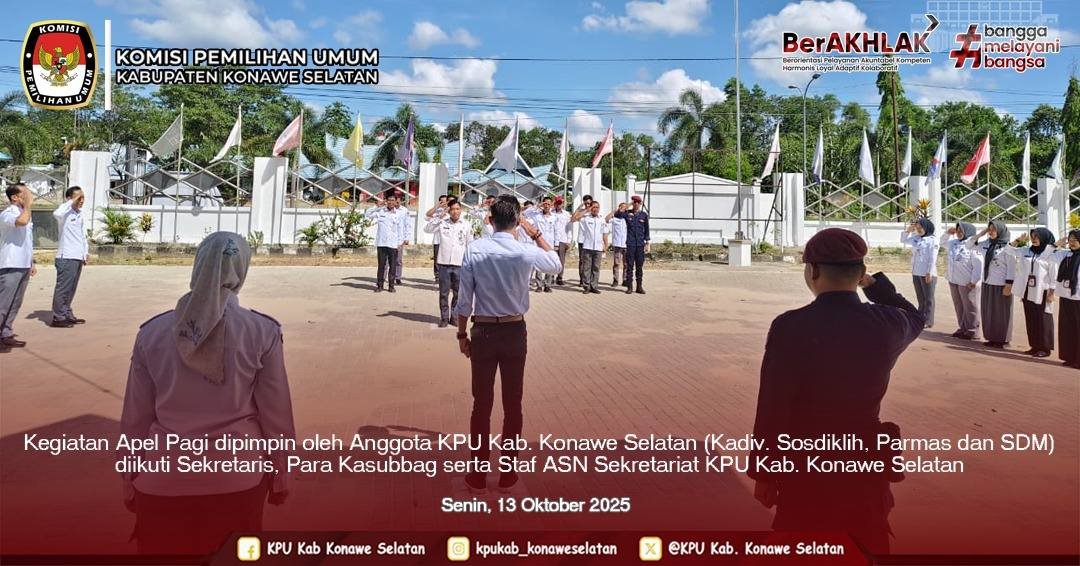 KPU Kabupaten Konawe Selatan melaksanakan Kegiatan Apel Pagi pukul 07:30 yang dipimpin oleh Anggota KPU Kabupaten Konawe Selatan (kadiv. Sosdiklih, Parmas dan SDM) diikuti Sekretaris, Para Kasubag serta Staf ASN Sekretariat KPU Kabupaten Konawe Selatan.