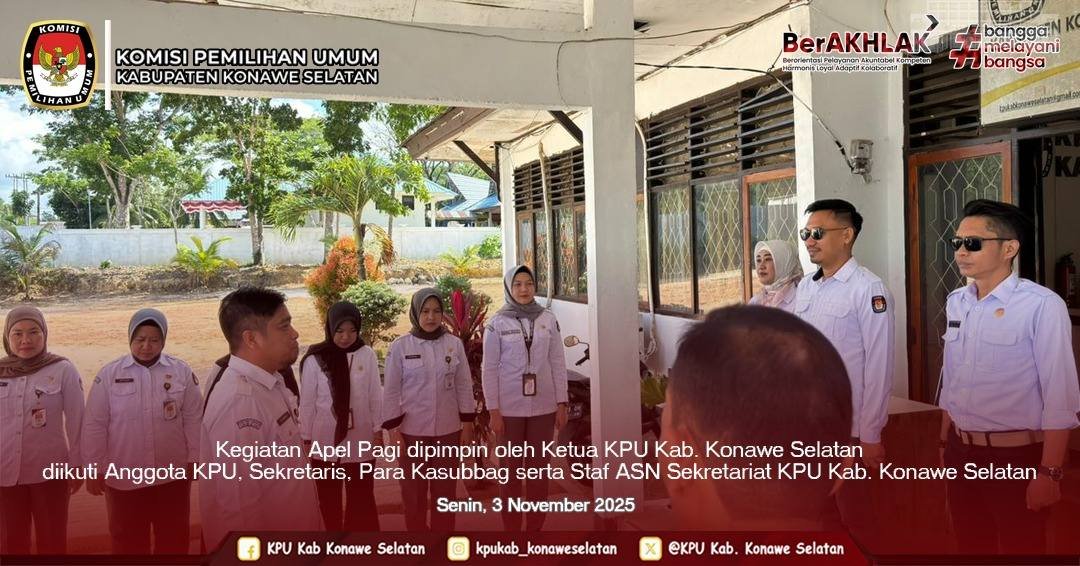 KPU Kabupaten Konawe Selatan melaksanakan Apel Pagi yang dipimpin oleh Ketua KPU Kabupaten Konawe Selatan diikuti Anggota KPU, Sekretaris, Para Kasubag serta Staf ASN Sekretariat KPU Kabupaten Konawe Selatan.