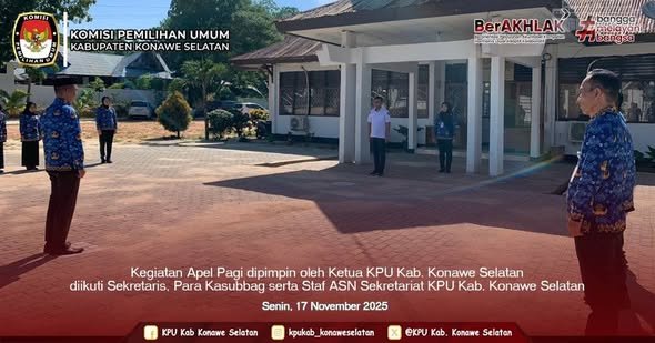 KPU Kabupaten Konawe Selatan melaksanakan Apel Pagi, 17 November 2025 yang dipimpin oleh Ketua KPU Kabupaten Konawe Selatan diikuti Sekretaris, Para Kasubbag serta Staf ASN Sekretariat KPU Kabupaten Konawe Selatan.