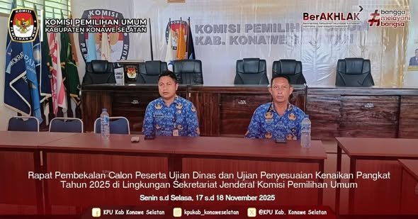 Calon Peserta Ujian Dinas Tingkat I KPU Kabupaten Konawe Selatan mengikuti Rapat Pembekalan Calon Peserta Ujian Dinas dan Ujian Penyesuaian Kenaikan Pangkat Tahun 2025 di Lingkungan Sekretariat Jenderal Komisi Pemilihan Umum secara Daring selama 2 (dua) hari yang diselenggarakan oleh KPU RI bekerjasama dengan BKN RI pada hari Senin s.d Selasa, 17 s.d 18 November 2025.