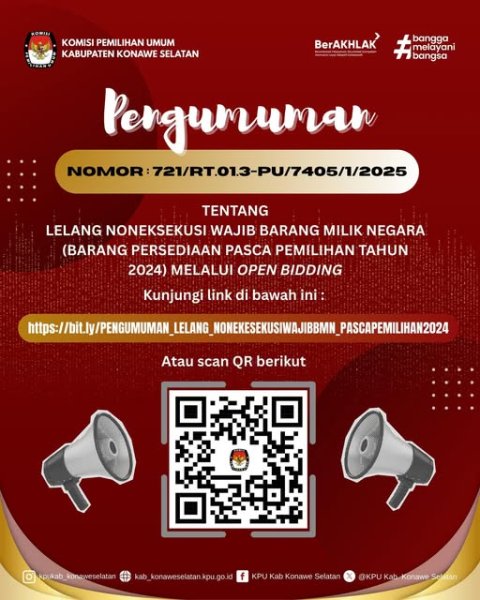 Komisi Pemilihan Umum Kabupaten Konawe Selatan akan melaksanakan Lelang Noneksekusi Wajib Barang Milik Negara (Barang Persediaan Pasca Pemilihan Tahun 2024) melalui Oven Bidding