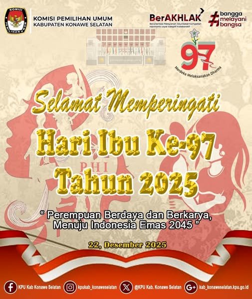 KPU Kabupaten Konawe Selatan mengucapkan Selamat Memperingati Hari Ibu Ke- 97 Tahun 2025, 22 Desember 2025.