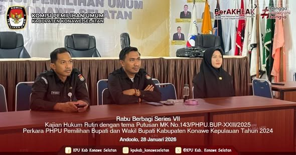 KPU Kabupaten Konawe Selatan mengikuti kegiatan Kajian Rutin JDIH KPU Provinsi Sulawesi Tenggara melalui Program “Rabu Berbagi Series VII, Kajian Hukum Rutin dengan tema Putusan MK No. 143/PHPU.BUP-XXIII/2025 Perkara PHPU Pemilihan Bupati dan Wakil Bupati Kabupaten Konawe Kepulauan Tahun 2024” yang diselenggarakan oleh KPU Provinsi Sulawesi Tenggara secara Daring pada hari Rabu, 28 Januari 2026.