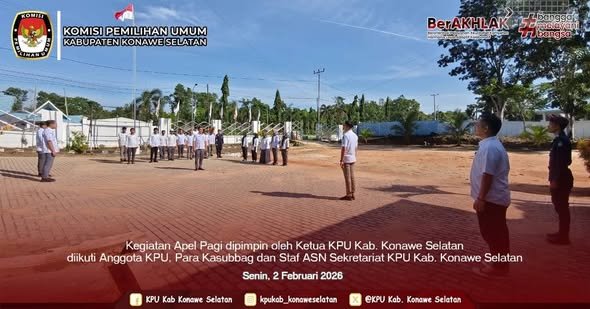 KPU Kab. Konawe Selatan melaksanakan Apel Pagi, 2 Februari 2026 yang dipimpin oleh Ketua KPU Kab. Konawe Selatan, diikuti Anggota KPU Kab. Konawe Selatan, Para Kasubbag serta Staf ASN Sekretariat KPU Kab. Konawe Selatan.