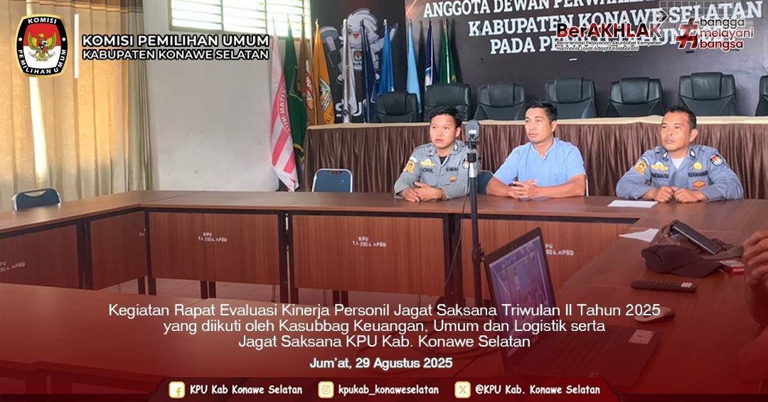 #TemanPemilih, KPU Kab. Konawe Selatan melaksanakan Kegiatan Rapat Evaluasi Kinerja Personil Jagat Saksana Triwulan II Tahun 2025 yang diikuti oleh Kasubbag Keuangan, Umum dan Logistik serta Jagat Saksana KPU Kab. Konawe Selatan. Jum'at 29 Agustus 2025