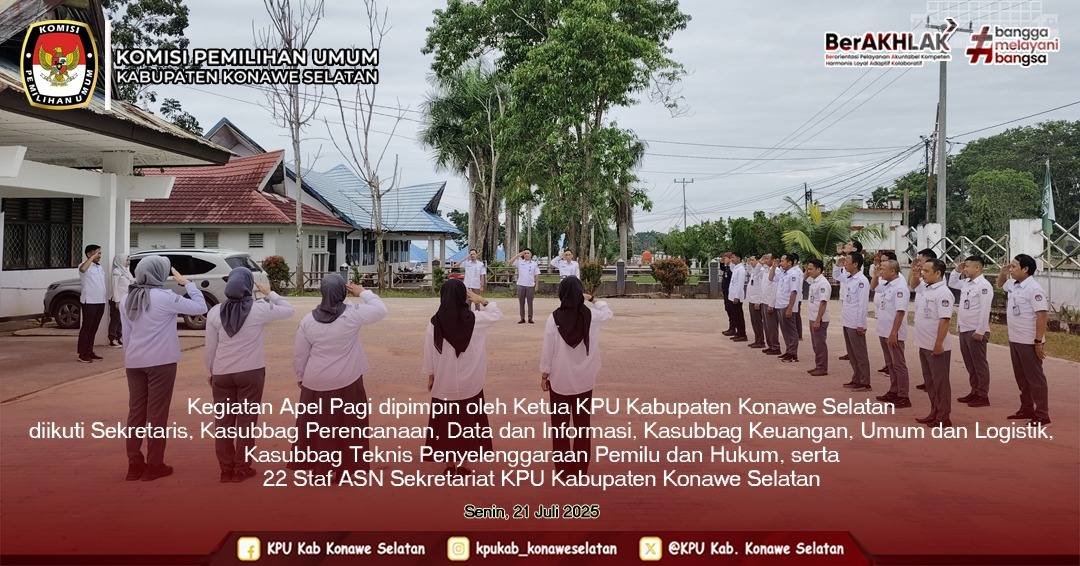 #TemanPemilih KPU Kabupaten Konawe Selatan Melaksanakan Kegiatan Apel Pagi yang dipimpin oleh Ketua KPU Kab. Konawe Selatan, Sekretaris, Kasubbag serta seluruh Staf ASN Sekretariat KPU Kabupaten Konawe Selatan.