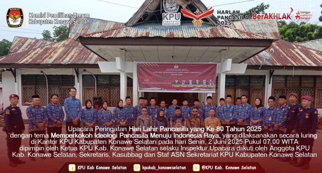 #TemanPemilih, Senin, 2 Juni 2025. KPU Kabupaten Konawe Selatan menggelar Upacara Bendera dalam rangka memperingati hari lahir Pancasila 1 Juni 2025 di Halaman Kantor KPU Kabupaten Konawe Selatan.