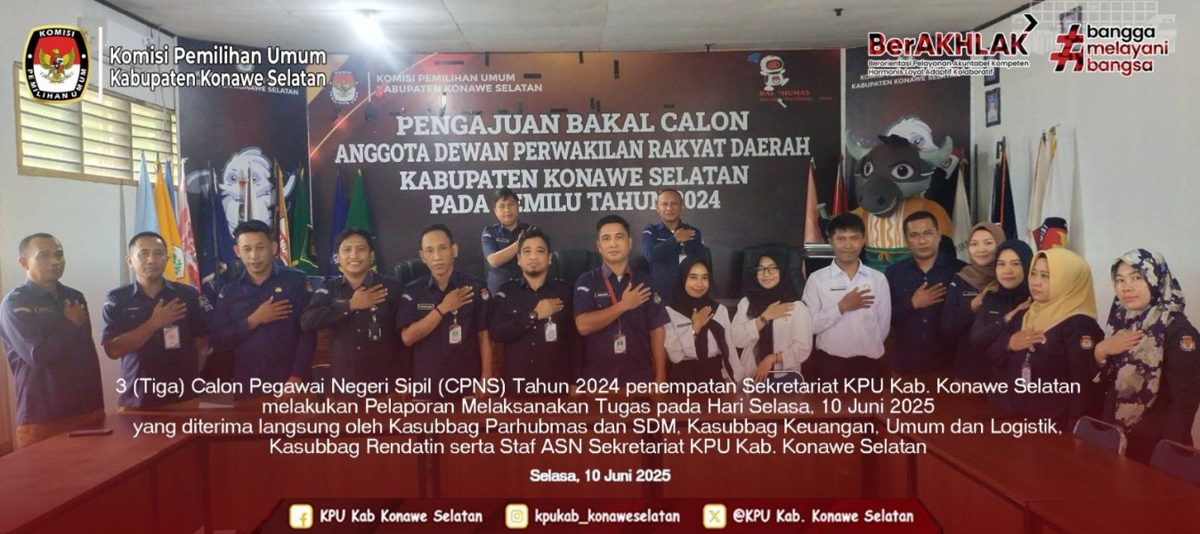#TemanPemilih, Selasa, 10 Juni 2025 KPU Kab.Konawe Selatan Menerima Calon Pegawai Negeri Sipil (CPNS) Tahun 2024, oleh Kasubbag Parhubmas dan SDM, Kasubbag Keuangan Umum dan Logistik, Kasubbag Rendatin serta Staf ASN Sekretariat KPU Kab. Konawe Selatan