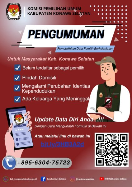 KPU Kabupaten Konawe Selatan kembali mengajak masyarakat Kabupaten Konawe Selatan yang merasa belum terdaftar sebagai Data Pemilih, Pindah Domisili. Mengalami Perubahan Identitas Kependudukan, baru berusia 17 Tahun, Pensiunan TNI/Polri, atau ada keluarga yang meninggal dunia, silahkan melaporkan untuk melakukan perubahan data Pemilih dengan mengklik link bit.Iy/3H3A2d.